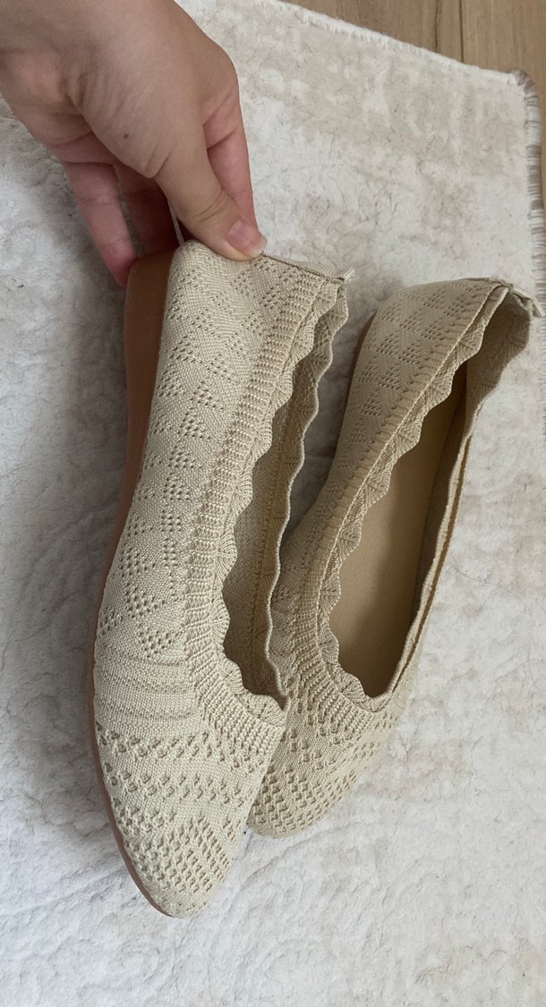 Bej renkli, örgü kumaştan yapılmış dolgu topuklu kadın ayakkabısı, bohem tarzında ve günlük rahat kullanım için uygundur. Sadece 1 kere giyinildi