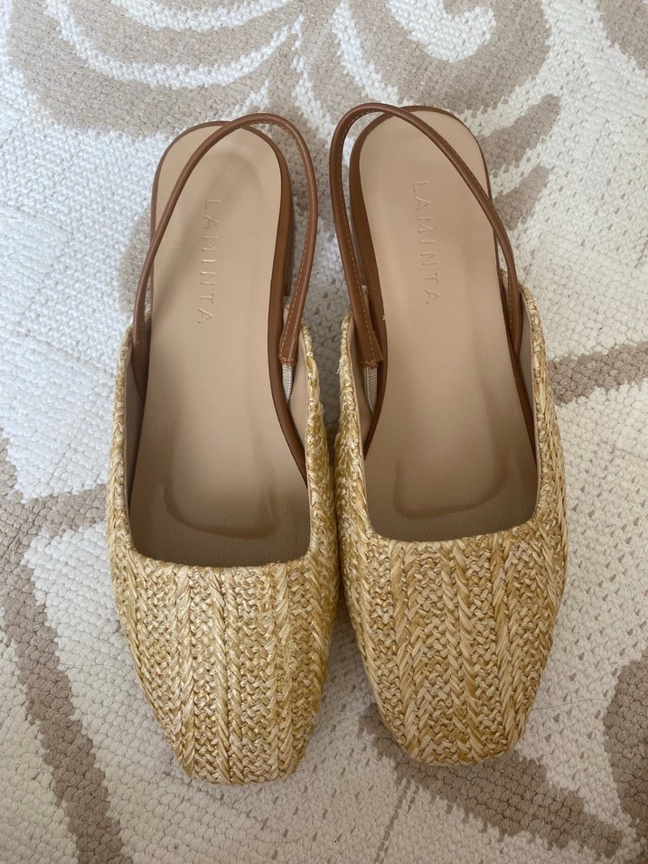Bej renkli örgü dokulu, dolgulu topuklu ve tokalı kayışlı espadril. Bir kere giyildi