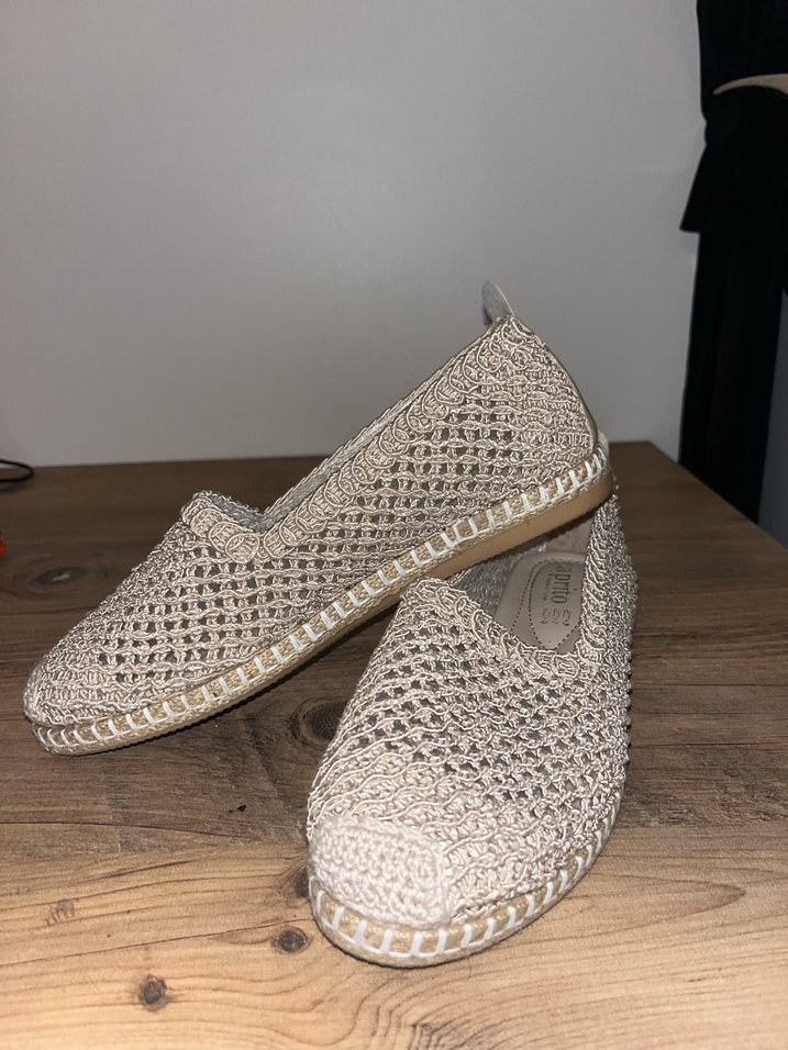 Bej renkli, örgü detaylı, dolgu topuklu kadın espadril. Minimalist bohem tarzıyla günlük kullanıma uygundur. Sadece 1 kere 1 saat kadar giyildi çok rahat yumuşak taban