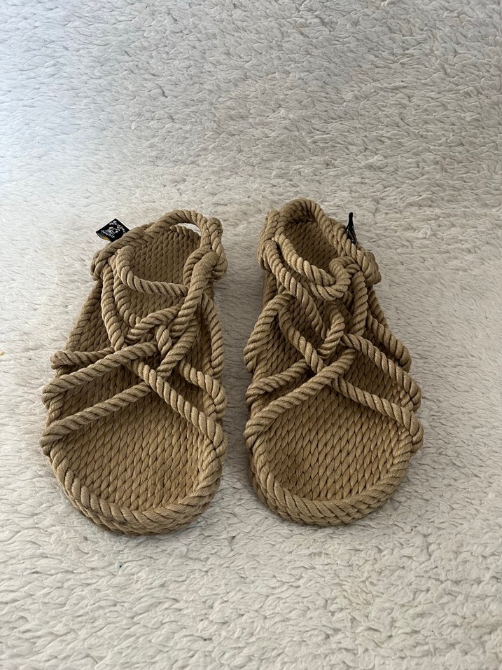 Yün malzemeden yapılmış, bej renkli örgü dolgu topuk sandalet. Rahat ve bohem tarzıyla günlük kullanım için uygun.
