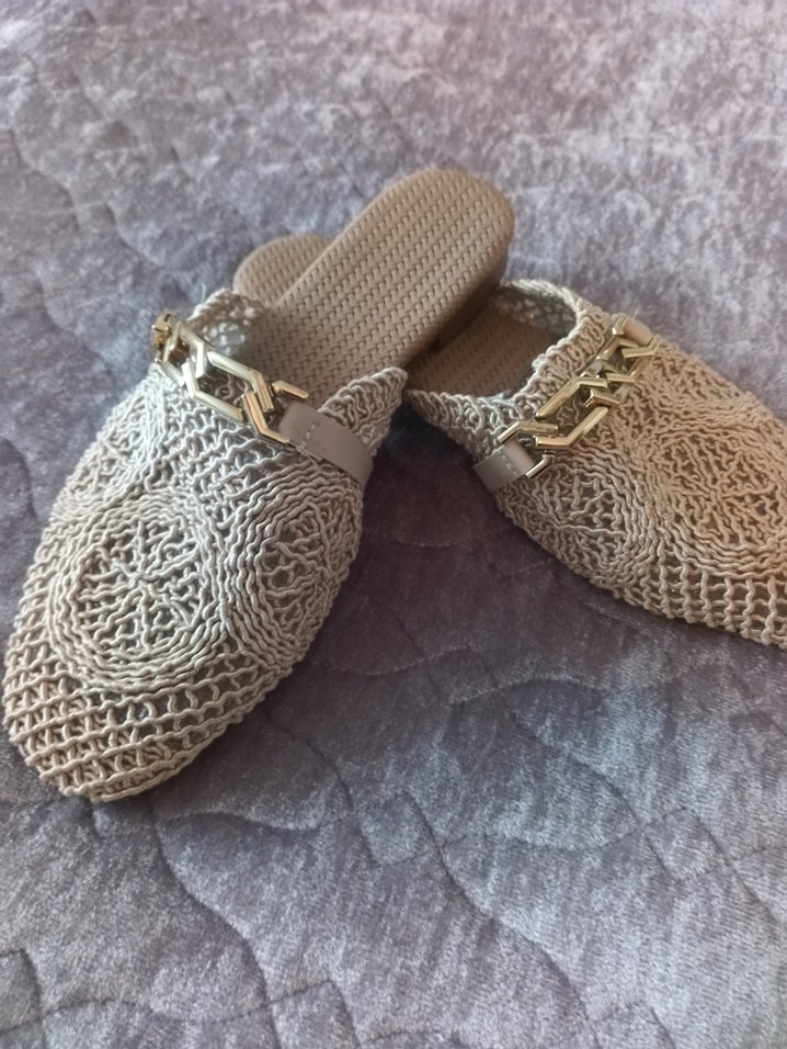 Bej renkli örgü kadın terlikler, dolgu topuklu ve işlemeli desenli, metal zincir detaylı, bohem tarz için uygun.