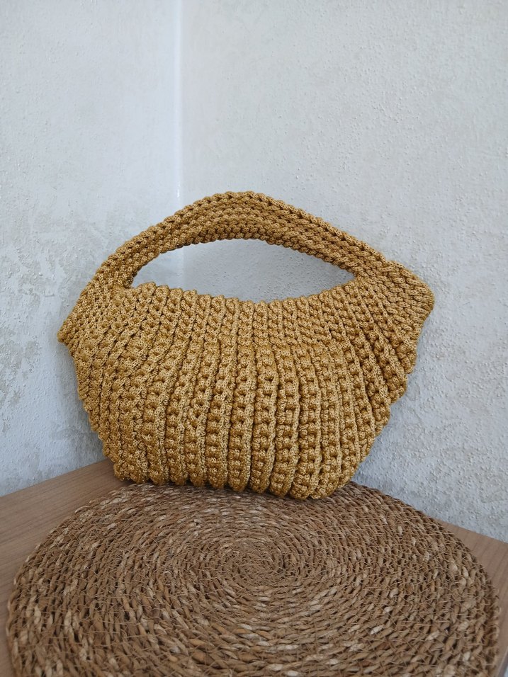 Bohem tarzda, yumuşak örgü dokulu, sade ve rahat bej kadın el çantası, günlük kullanım için uygundur.