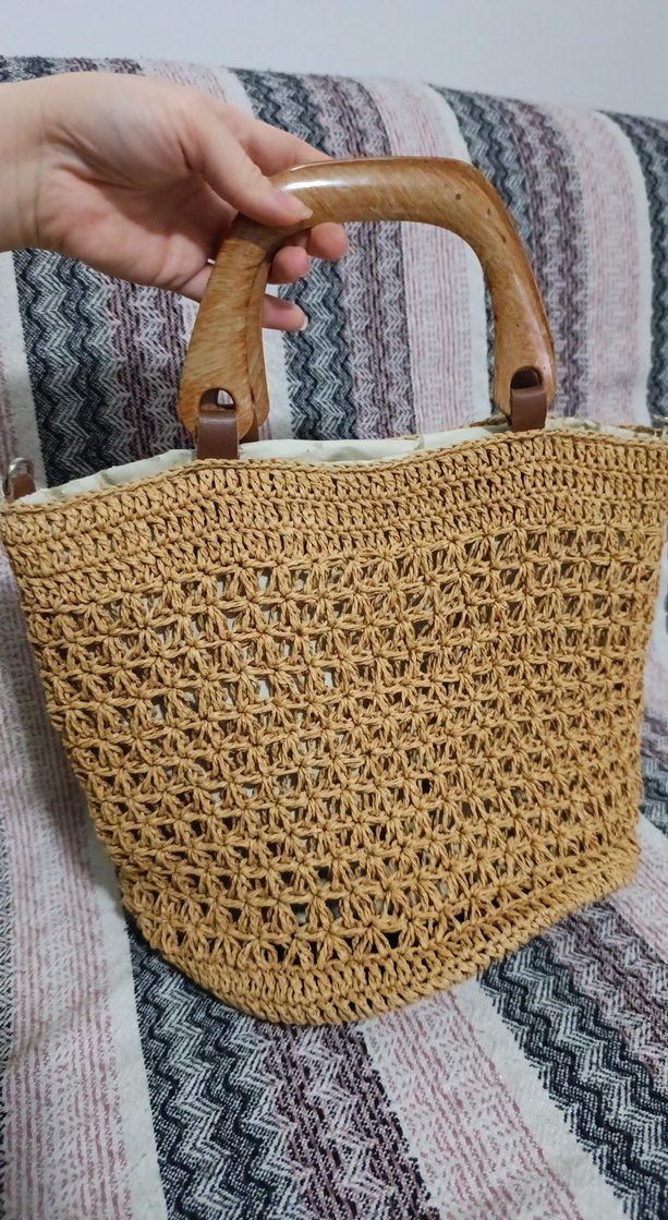 Bej renkli, örgü dokuma kadın el çantası, ahşap saplı ve desensiz yapısıyla bohem tarzda, günlük kullanıma uygun rahat bir modeldir.