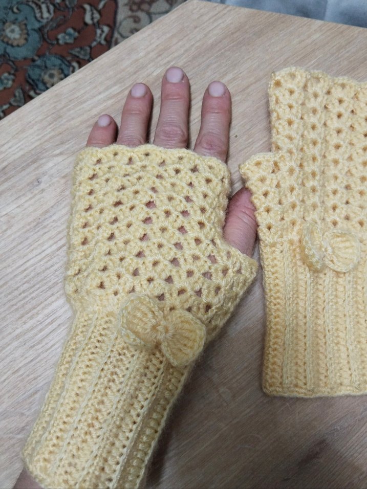 Bej renkli, örgü kadın eldivenler. Bohem tarzda, delikli örme ve süslü fiyonk detaylıdır. ellerinizi sıcacık tutar cüzdan telefon kullanırken rahatlık konfor şıklık katacak
