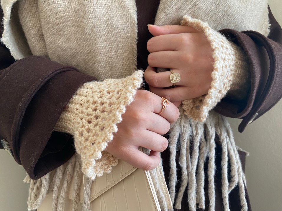 Bej renkli kadın eldivenleri, örgü tasarımı ve bohem tarzıyla dikkat çekiyor. Yumuşak örme kumaştan üretilmiştir ve sıcaklık sağlar. parmaksızdır