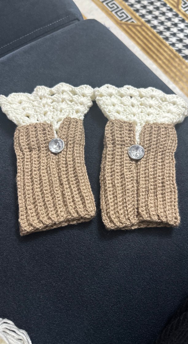 Bej renkli, örgü kadın eldivenleri, bohem tarzda, dekoratif düğmelerle ve hafif bir örgü deseniyle. Yumuşak ve nostaljik bir görünüm sağlar. El emeği vintage eldiven