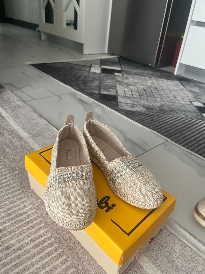 Nakış detaylı, örgü bej espadriller. Günlük kullanıma uygun, rahat ve bohem tarzda bir model. Çok rahata ve kullanışlı. Bir kere içeride kullanıldı sadece. Tayin sebebi ile tüm dolabımı boşaltıyorum. Ben mağazadan 1200’e almıştım.