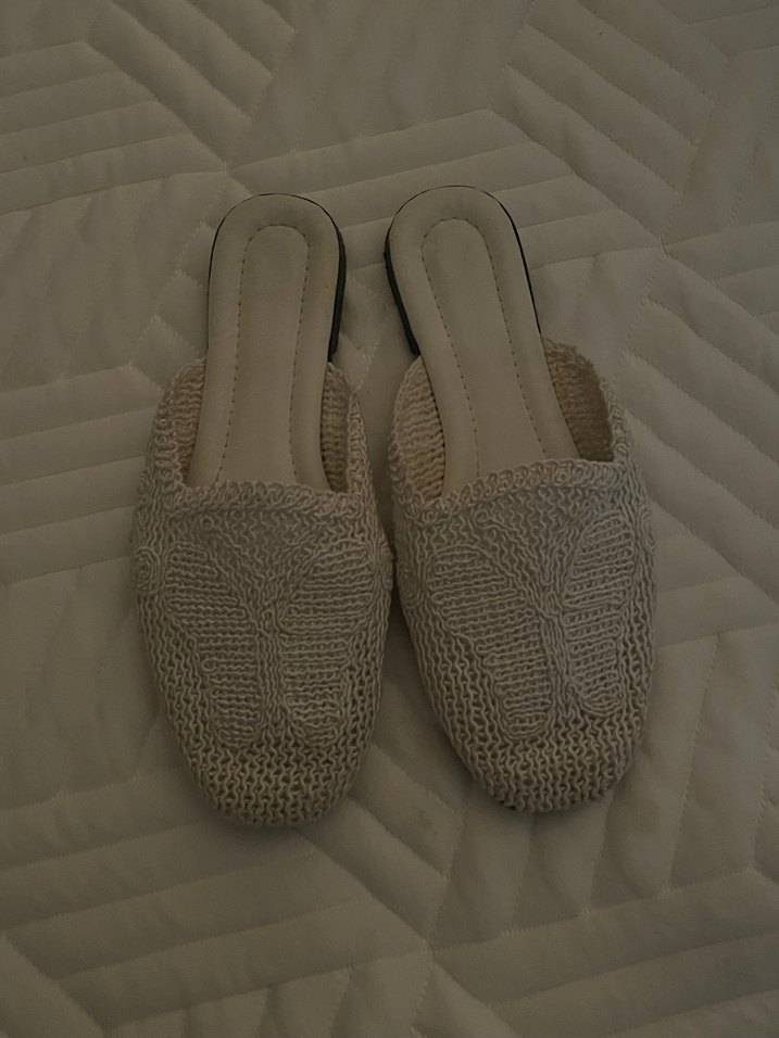 Bej renkli, blok topuklu örgü kadın yaz terliği, yumuşak örgü üst yüzey ve sade tasarımıyla günlük kullanım için uygundur.