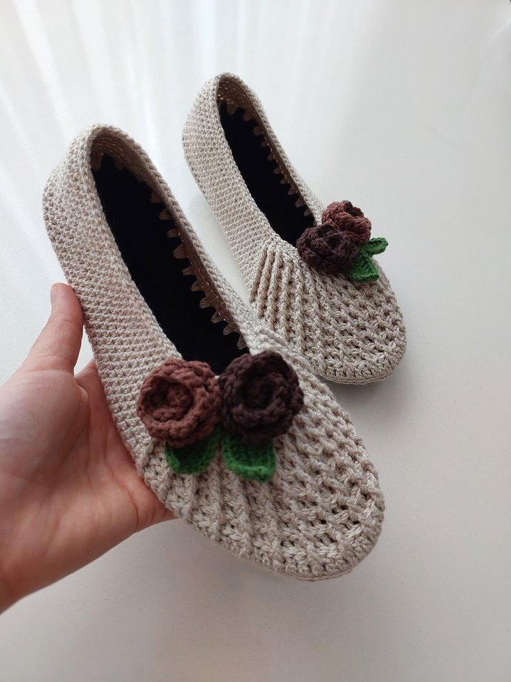 Bej renkli, örgü kadın ev terliği, çiçek detaylı ve stiletto topuklu. Rahat örgü kumaş ve retro bohem tarzıyla günlük kullanıma uygun.