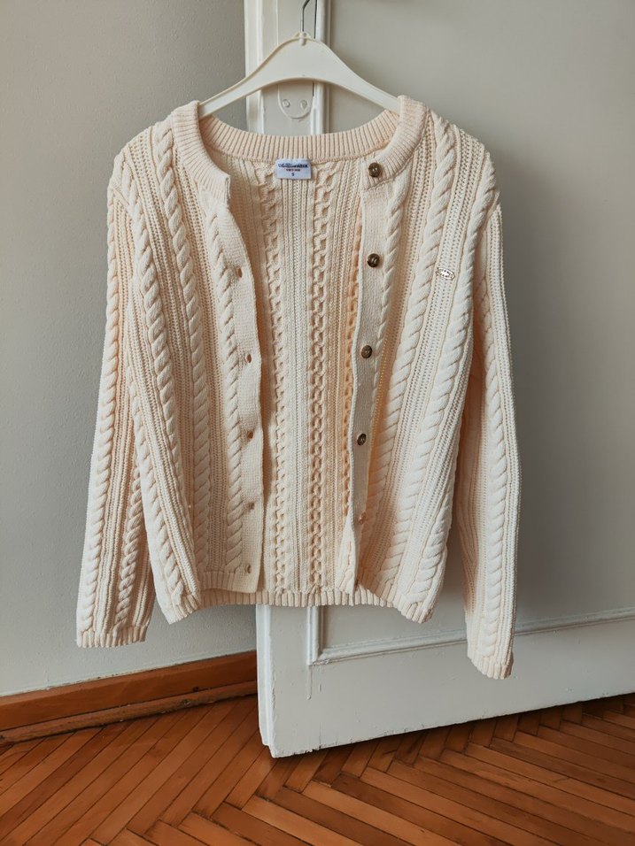 Bej renkli, örgü dokulu, rahat kesim ve uzun kollu kadın hırkası. Düğmeli, desen içermeyen, günlük kullanıma uygun bir modeldir.