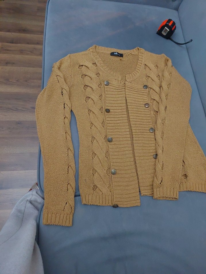 Bej renkli, uzun kollu, bol kesim örgü kadın hırka. Yakalı ve düğmeli detaylara sahip, günlük kullanıma uygun. yakasında sökülme vardı dikildi onun dışında yepyeni tarz bir modeldir