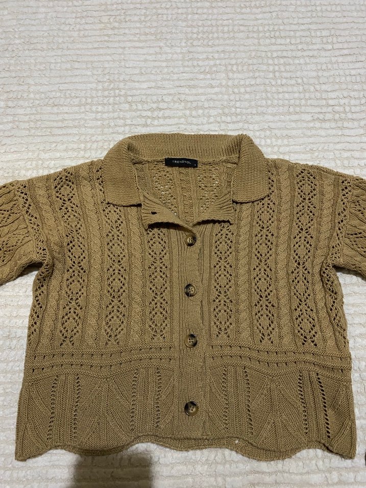 Bej renkli, örgü kadın hırka, uzun kollu ve yaka detaylıdır. Bol kesim, bohem tarzda ve midi boyda, günlük kullanıma uygundur.