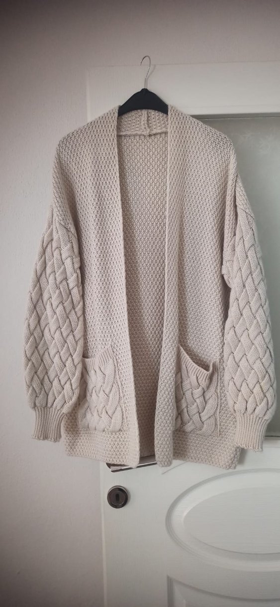 Bej renkli, örgü ve bol kesim kadın hırka, uzun kabartmalı kollar ve ön ceplerle günlük kullanıma uygundur.