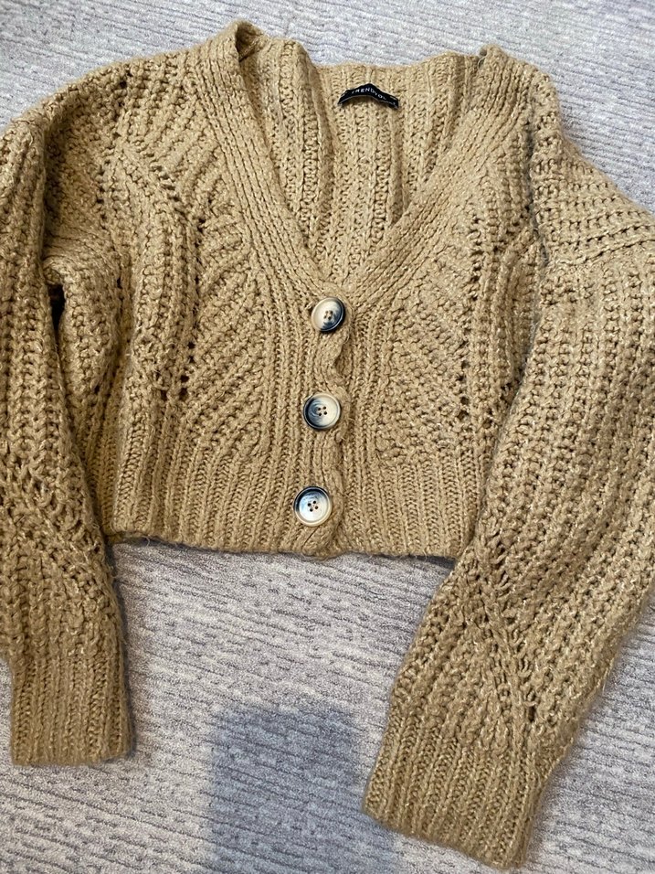 Bej renkte, örgü kumaştan, uzun kollu ve notlu yakalı, midi boy rahat kesim kadın hırkası. Trendy ve günlük kullanıma uygun.