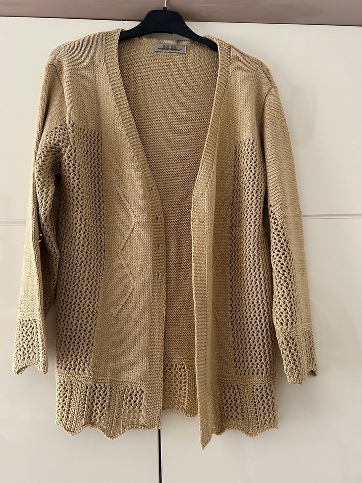 Bej renkli, uzun kollu, yakası kesik detaylı örgü kadın hırka. Salaş kesimi ve midi boyuyla rahat ve günlük kullanıma uygun. Tüylenme yapmaz bir kere giyilmiştir