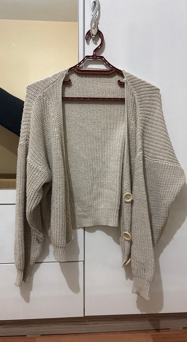 Bej renkli, örgü triko kadın hırka, bol kesimdir. Uzun kollu ve notched lapel yakaya sahiptir. Midi boyu ve desensiz yapısıyla günlük kullanıma uygundur.