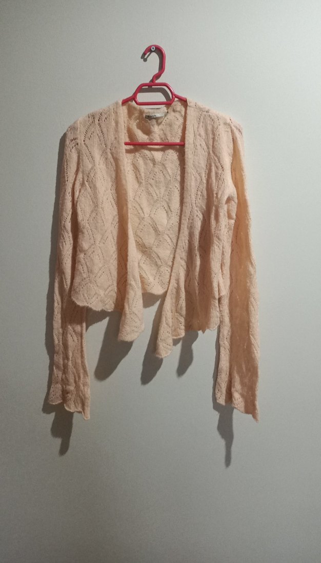 Bej renkte, uzun kollu, kısa kesim ve notched lapel yakalı örgü kadın hırka. Bohem tarzda, rahat ve günlük kullanıma uygun.