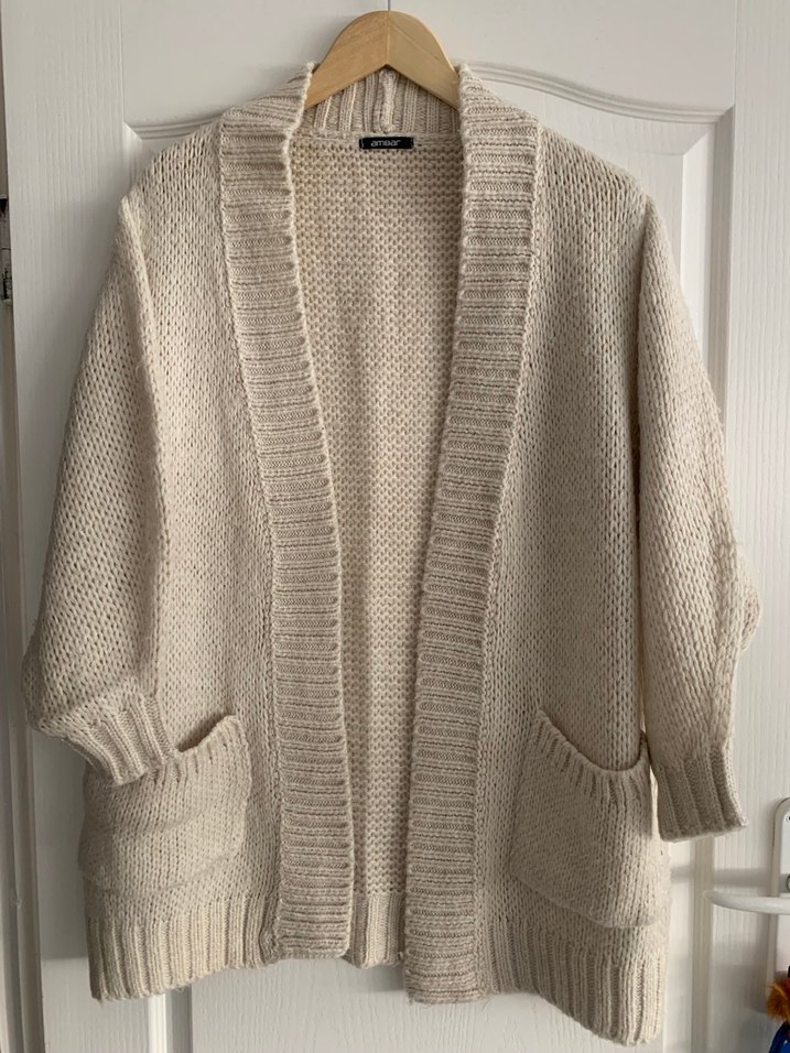 Bej renkte, örgü dokulu, salaş kesim, uzun kollu, normal uzunlukta, yakası kesimli kadın hırka. Günlük kullanıma uygundur. Ambar marka