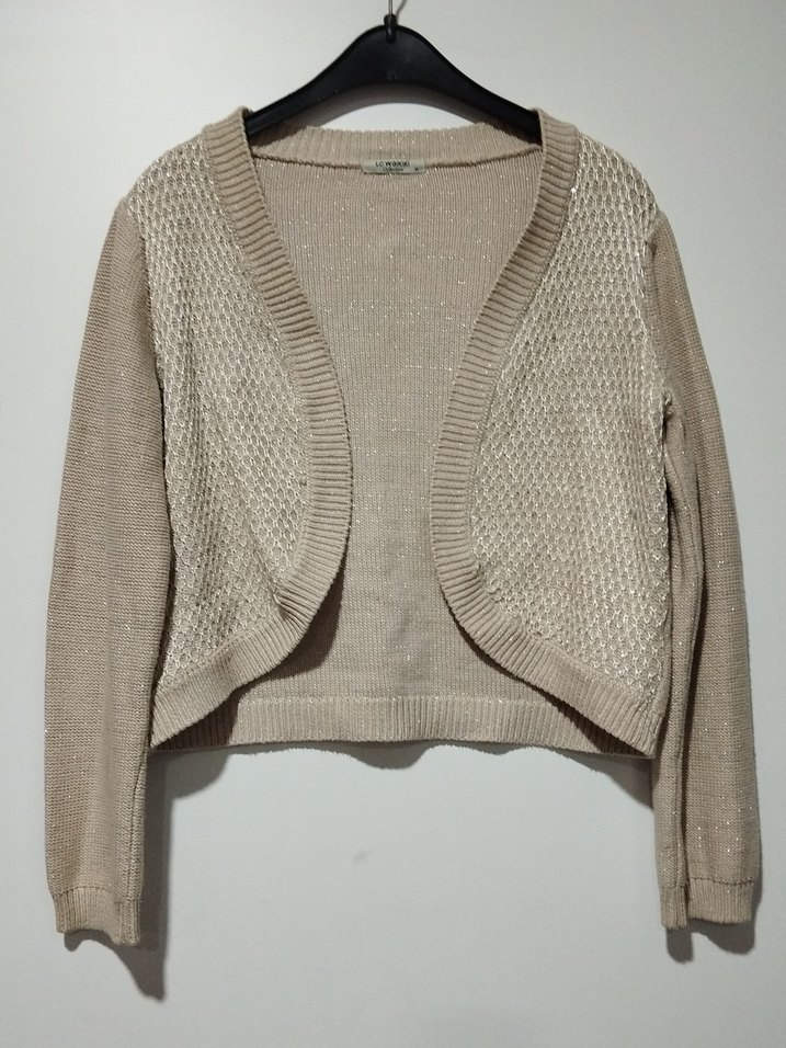 Bej renkli, uzun kollu, örgü dokulu kadın hırka. Normal boyda, vücuda oturan kesimi ve yuvarlak yaka detayıyla günlük kullanıma uygundur.