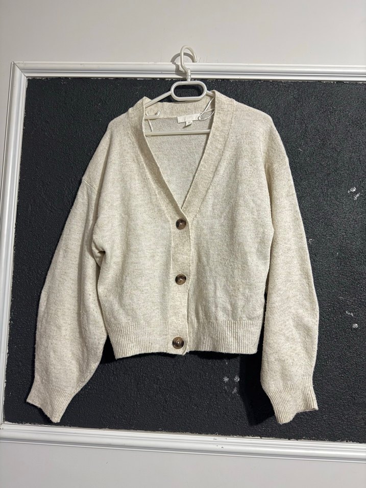 Bej renkli, örgü yün hırka, uzun kollu ve kesik yaka detaylı. Rahat kesimi ve düğmeli kapanışıyla gündelik kullanıma uygundur.