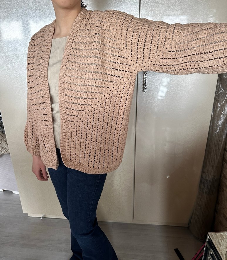 Bej renkli, örme kumaştan yapılmış, V yaka ve rahat kesime sahip kadın hırkasıdır. Uzun kollu ve midi boyda, günlük kullanıma uygundur. Tığla yeni örüldü
