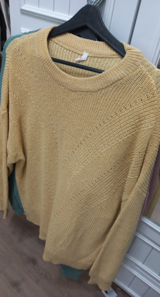 Bej renkli, örgü dokulu kazak, yuvarlak yaka ve uzun kolludur. Rahat kesimi ve sade tasarımıyla günlük kullanıma uygundur.