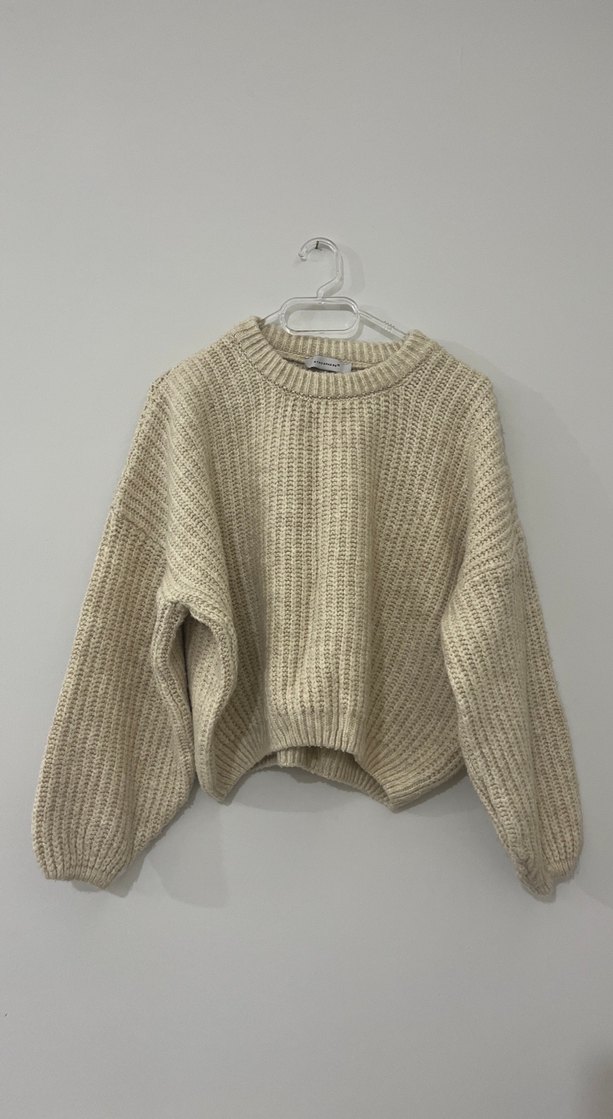 Bej renkli, örgü kadın kazak. Yuvarlak yaka ve uzun kollu, bol kesim ve normal midi boyda, günlük kullanıma uygun rahat bir parça.