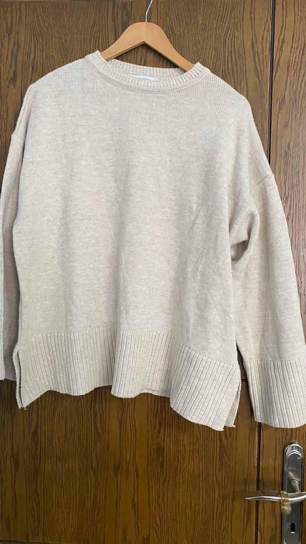 Bej renkli, uzun kollu, yuvarlak yaka, bol kesim örgü kadın kazak. Günlük kullanıma uygun sade tasarım.