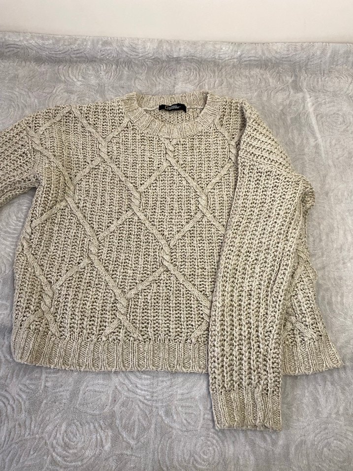 Bej renkli, örgü kadın kazak, rahat kesim, uzun kollu ve bisiklet yaka detayına sahiptir. Günlük kullanım için uygundur.
