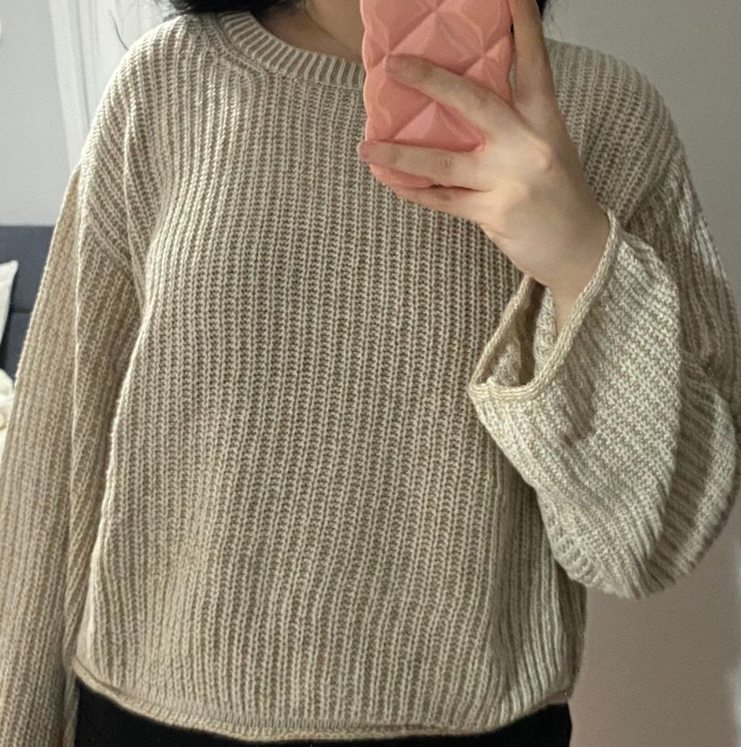 Bej renkli, örgü dokulu, yuvarlak yaka ve uzun kollu kadın kazak. Rahat kesimi ve normal boyuyla günlük kullanıma uygundur.