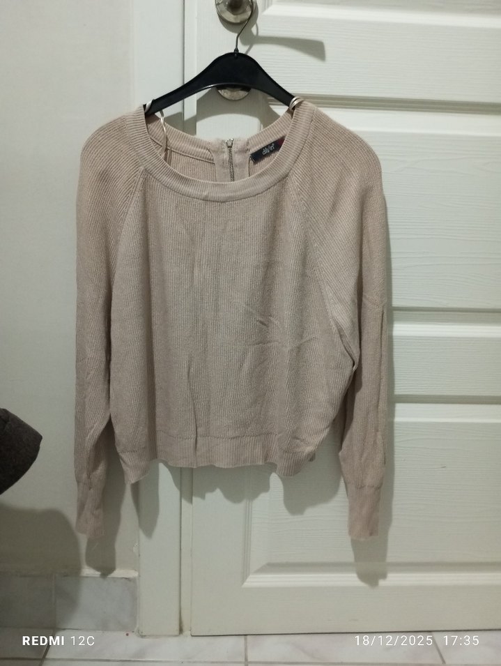 Bej renkli, uzun kollu, yuvarlak yaka ve bol kesim örgü keten kumaştan yapılmış kadın kazak, günlük rahat stil için uygundur.
