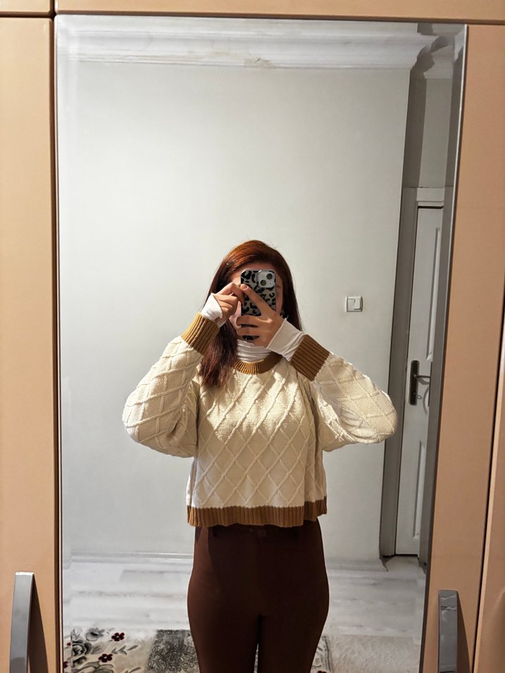 Bej renkli, uzun kollu kadın kazak. Örgü dokusuyla rahat ve bol kesim, manşet ve etek kısmında kahverengi ribanalı detaylar bulunur.