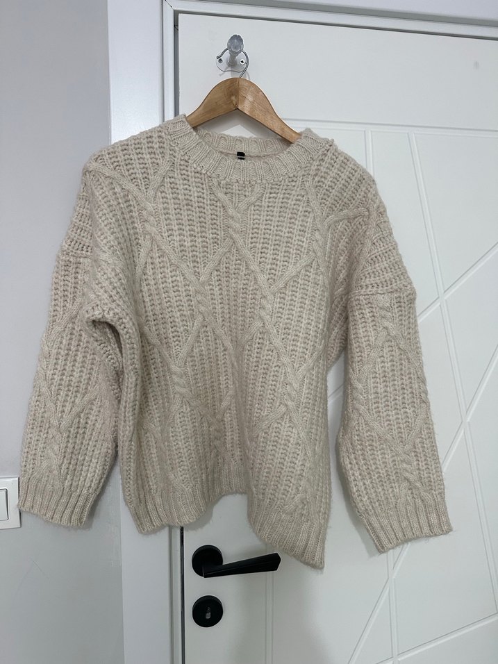 Bej renkli, örgü kumaştan uzun kollu ve yuvarlak yaka kadın kazak. Rahat kesimi ve normal boyu ile günlük kullanıma uygundur. Hiç giyilmedi