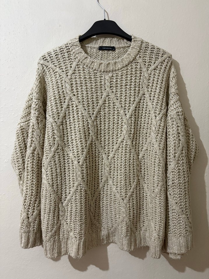 Bej renkli, örgü dokulu, yuvarlak yakalı ve uzun kollu kadın kazak. Rahat kesimi ve günlük kullanıma uygun yapısıyla bohem tarzı yansıtıyor.