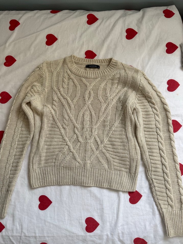 Bej renkli, örgü dokulu kadın kazak. Bisiklet yaka ve uzun kollu, vücuda oturan kesimiyle günlük ve sokak stiline uygun rahat bir parça.