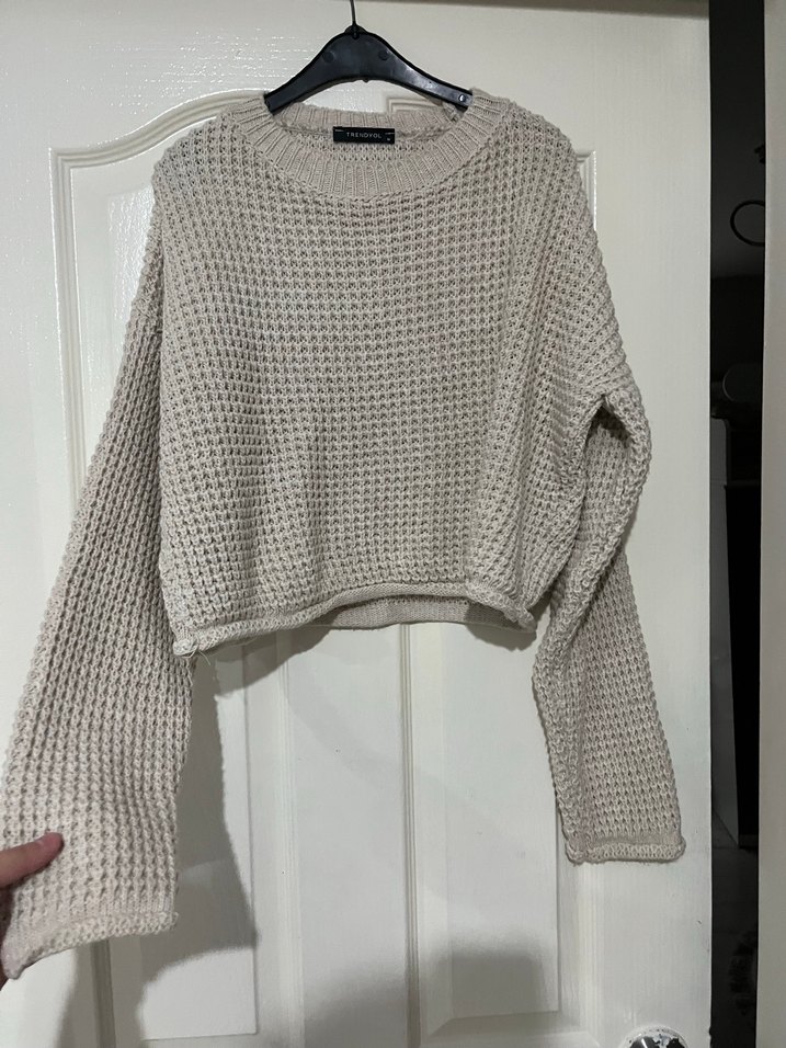 Bej renkli, uzun kollu, yuvarlak yakalı örgü kazak. Salaş kesimi ve normal boyu ile rahat sokak stiline uygun.