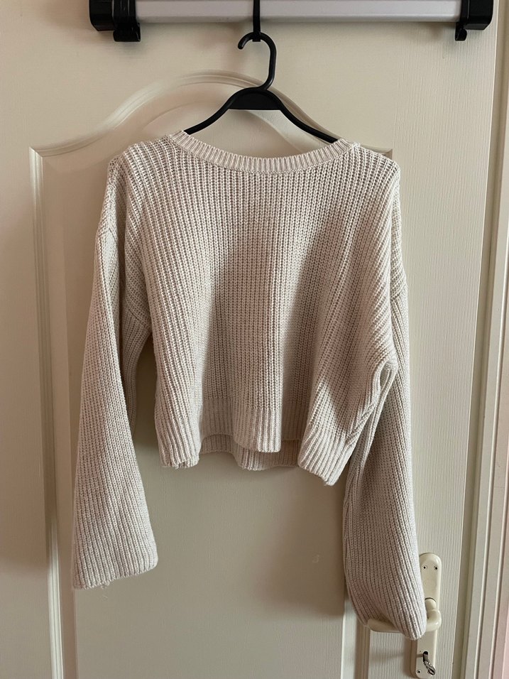 Bej renkli, örgü kumaştan yapılmış, uzun kollu ve yuvarlak yakalı kadın kazak. Rahat kesimi ve normal boyuyla günlük sokak stili için uygundur.