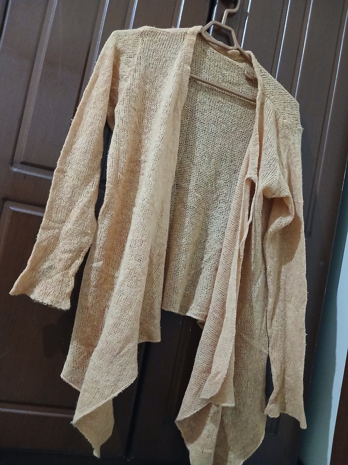 Bej renkli, keten kumaştan örülmüş, uzun kollu, notched lapel yakalı, bol kesim ve midi boyda rahat bohem tarzda kadın hırka. tam bahar zamanı olarak giynilecek hırka