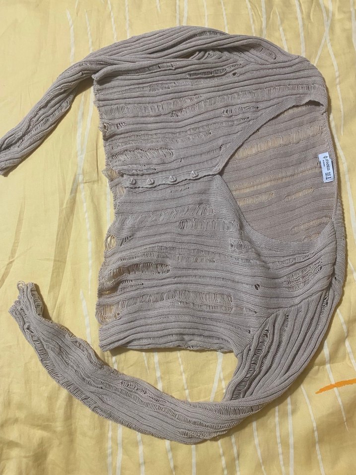 Bej renkli, keten dokulu örgü kazak, uzun kollu ve bohem tarzda. Vücuda oturan kesimi ve tek renk yapısıyla günlük kullanıma uygundur.