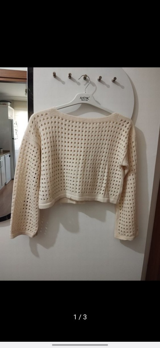 Bej renkli, uzun kollu, yuvarlak yakalı, kısa kesim örgü kazak. Salaş kesimi ve delikli örme dokusu rahat bir sokak stili sunar. Marka: HENK.