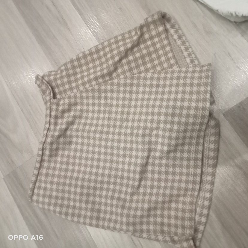 Örgü dokulu, bej renkli, bol kesim kadın kumaş pantolon. Midi boyda ve sade tasarımlı, günlük kullanıma uygun.