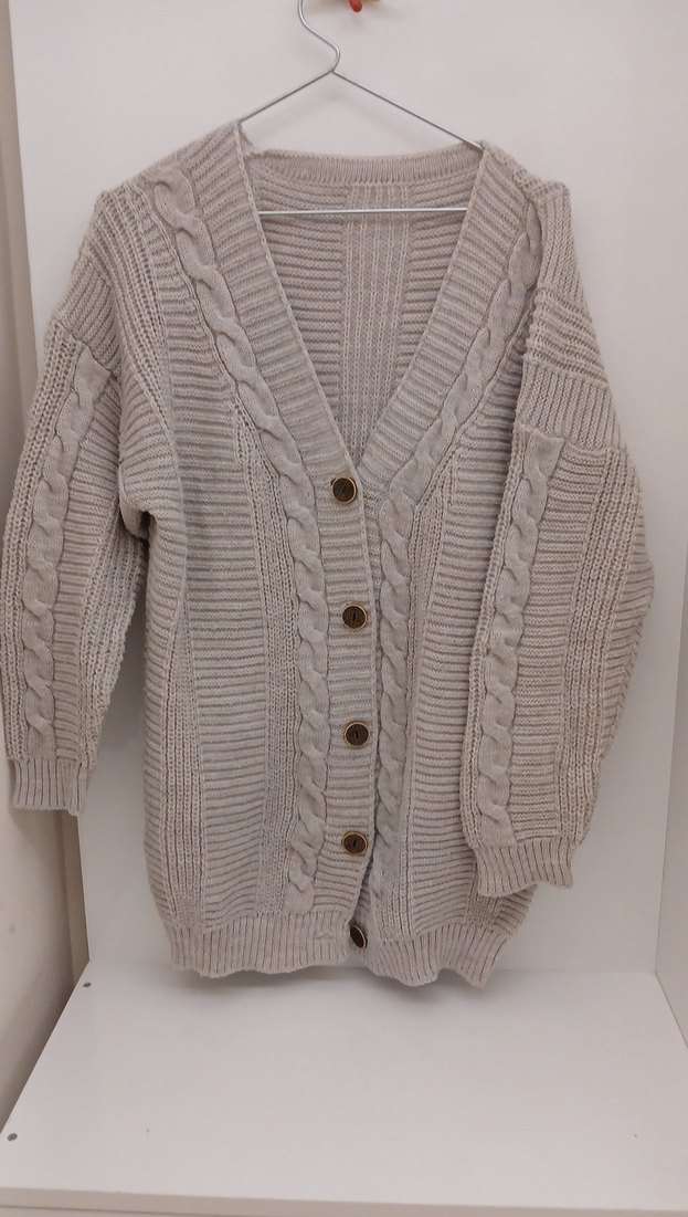 Bej renkte, uzun kollu, notched lapel yakalı ve düğmeli midi uzunlukta örgü kadın hırka. Rahat ve salaş kesimi günlük kullanıma uygundur.