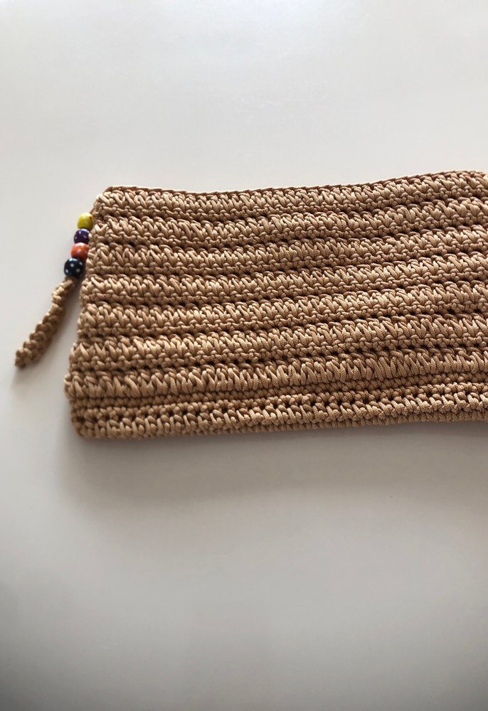 Hafif bej renkli, örgü kadın portföy çanta. Sade desensiz tasarımı ve fermuarında renkli boncuk detayları bulunur.