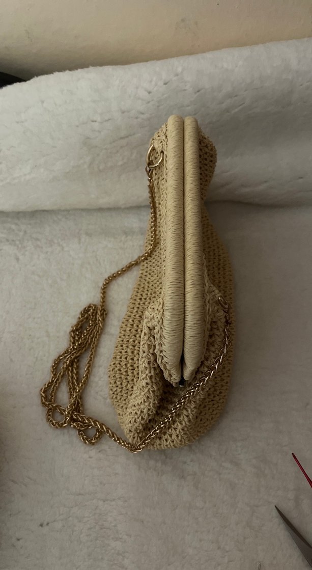 Bej renkli, örgü dokulu kadın portföy çanta, altın zincir askılı. Minimalist ve bohem tarzda, günlük kullanım için uygundur.