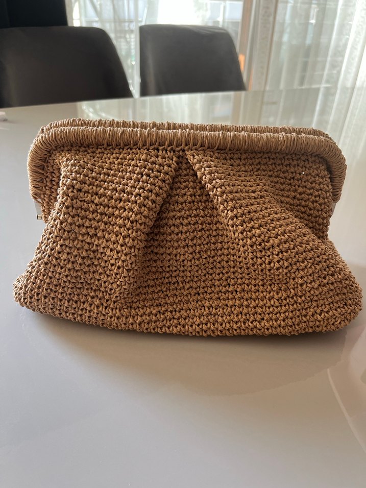 Hafif bej renkli, örgü dokulu, yumuşak yapılı ve bohem tarzda kadın portföy çanta. Gayet kullanışlı sıfır ürün.