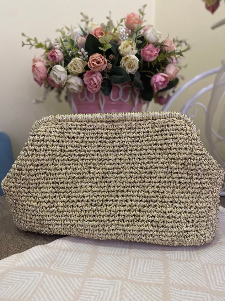 Bej renkli, örgü dokulu, rahat ve bohem tarzda kadın portföy çantası, günlük kullanıma uygundur.
