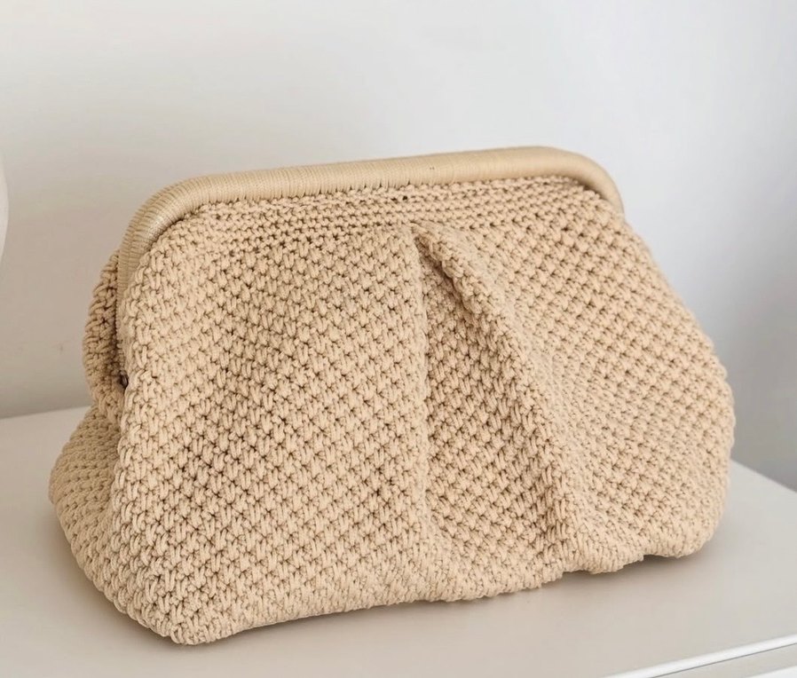 Yumuşak örgü kumaştan yapılmış bej renkli, sade ve rahat bohem tarzda kadın portföy çanta, günlük kullanım için uygundur.