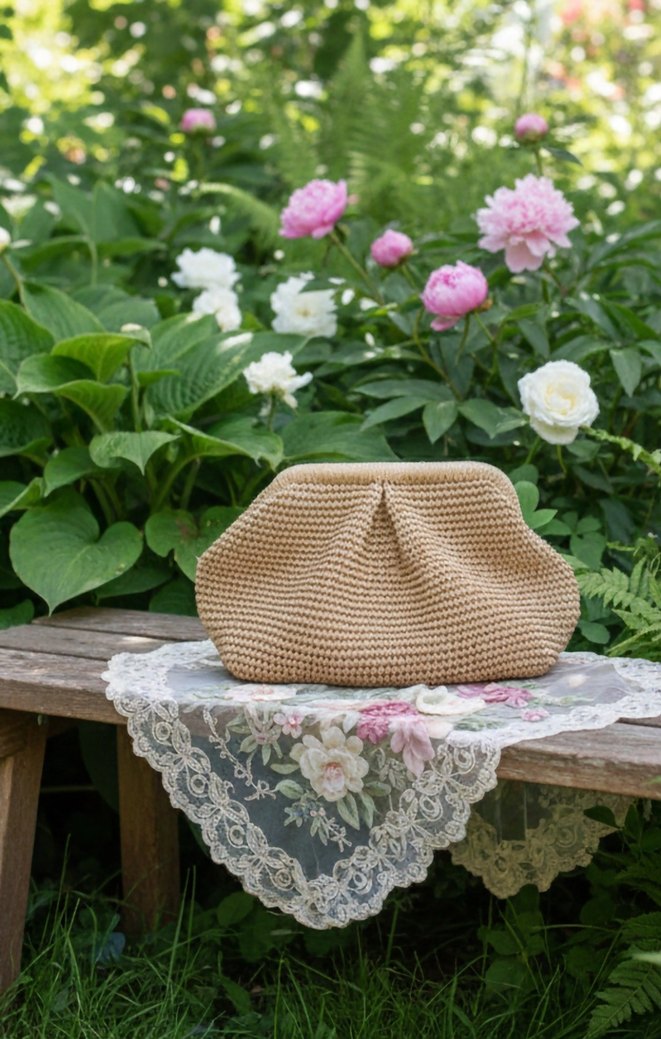 Yumuşak örgü dokusuna sahip bej kadın portföy çanta, günlük kullanıma uygun, bohem ve rahat tarzda.