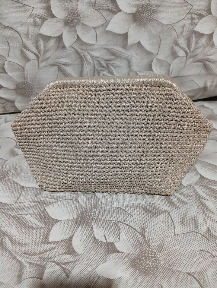 Bej renkli, örgü dokulu kadın portföy çanta. Yumuşak ve rahat dokusuyla vintage tarzına uygun, açık hava kullanımı için ideal.
