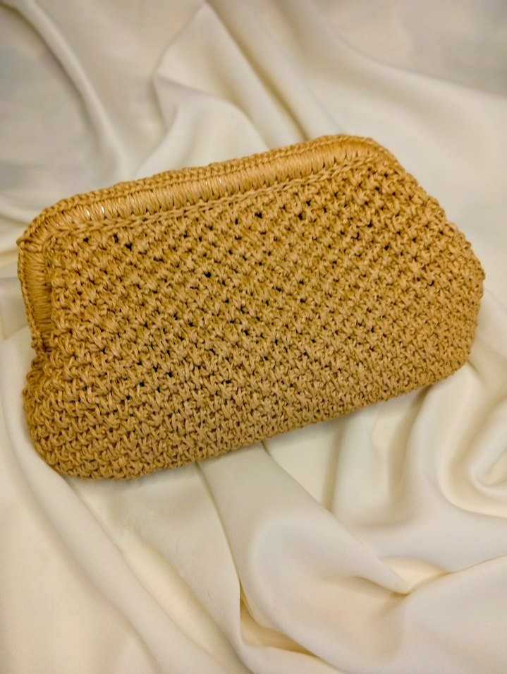 Bej renkli, örgü tasarımlı kadın portföy çanta. Rahat ve bohem tarzıyla günlük kullanıma uygun, hafif ve desensiz dokusu retro hippie havası katıyor. 16 cm burs, 18 cm yükseklik, 32 cm en. Hasır rengidir. Sipariş üzerine yapılır, 1-3 iş günü içinde kargolanır.